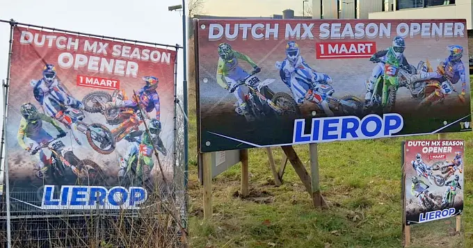 Nu de voorbereidingswerkzaamheden voor de Dutch MX Season opener inmiddels alweer ruim lange tijd gaande zijn, is ondertussen de PR-campagne ook in alle hevigheid losgebarsten, want momenteel kom je de borden in de omgeving van het Lieropse straatbeeld weer overal tegen.