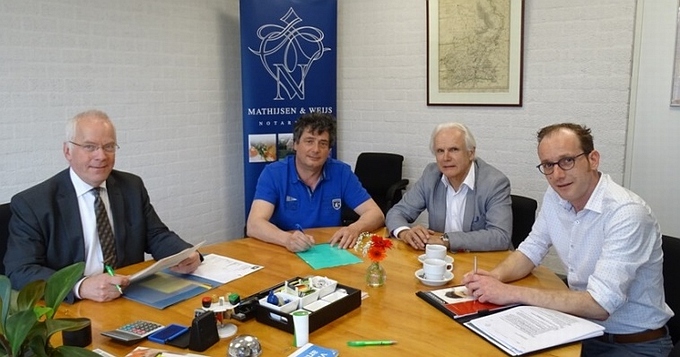 Foto: Ondertekening akte: v.l.n.r. notaris Weijs en het bestuur Marcel Hermans, Jan Kempen en Jeroen Verhoeven.